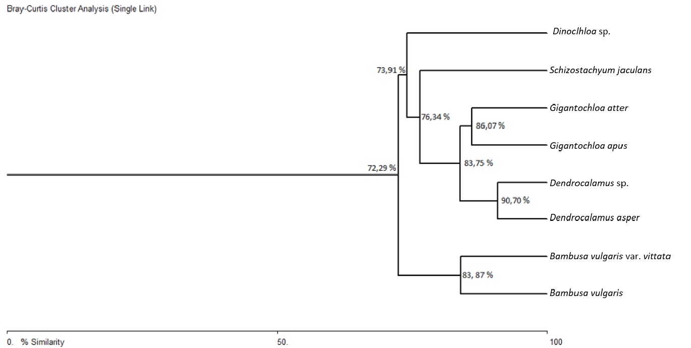 - Gambar 1. Dendrogram hubungan kekerabatan antar jenis bambu di sempadan sungai Keremit Resort Joben Taman Nasional Gunung Rinjani Lombok.