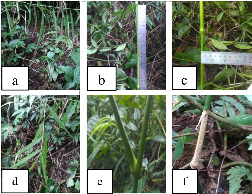 - Gambar 3. S. jaculan (a). rumpun, (b). batang, (c). buku-buku batang, (d). daun, (e). percabangan, (f). pelepah.