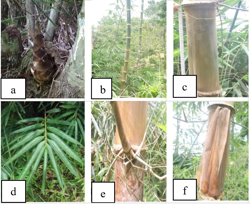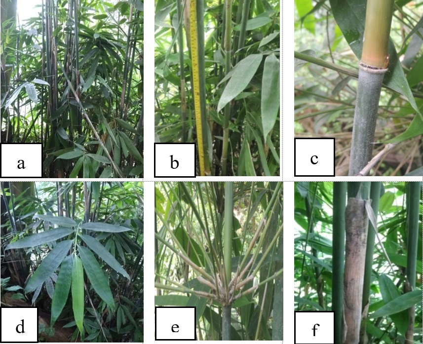 - Gambar 6. Dendrocalamus sp. (a). rebung, (b). rumpun, (c). batang, (d), daun, (e). percabangan, (f). pelepah.