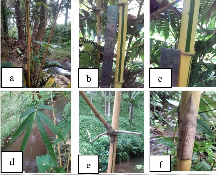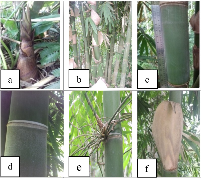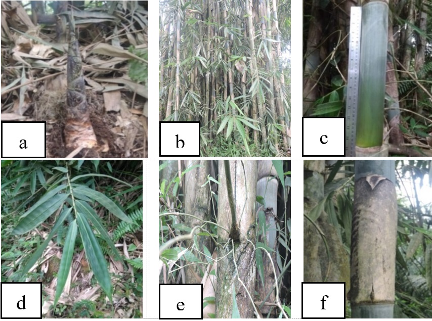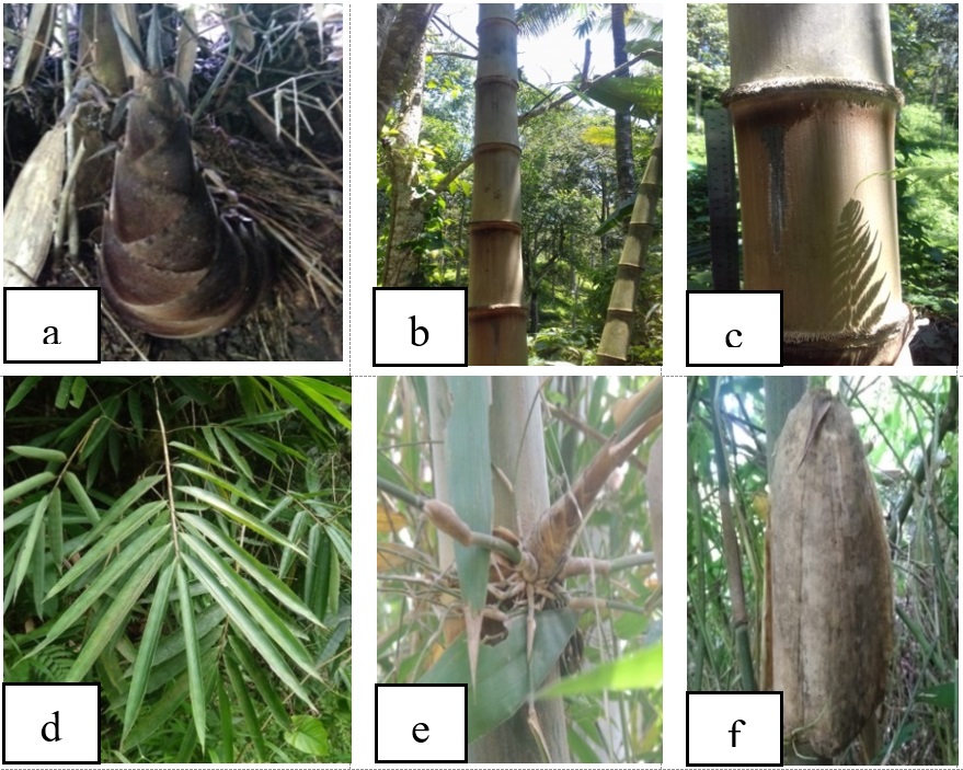 - Gambar 4. G. atter (a). rebung, (b). rumpun, (c). batang, (d). cincin, (e). percabangan, (f). pelepah.