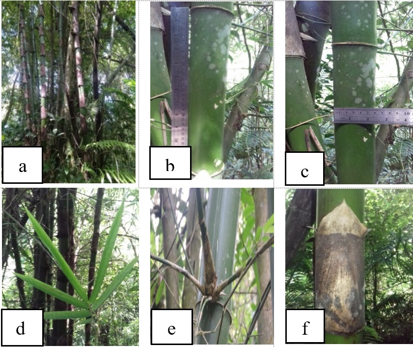 - Gambar 2. Dinochloa sp. (a). rumpun, (b). batang, (c). buku-buku batang, (d). daun, (e). percabngan, (f). pelepah.